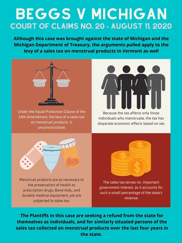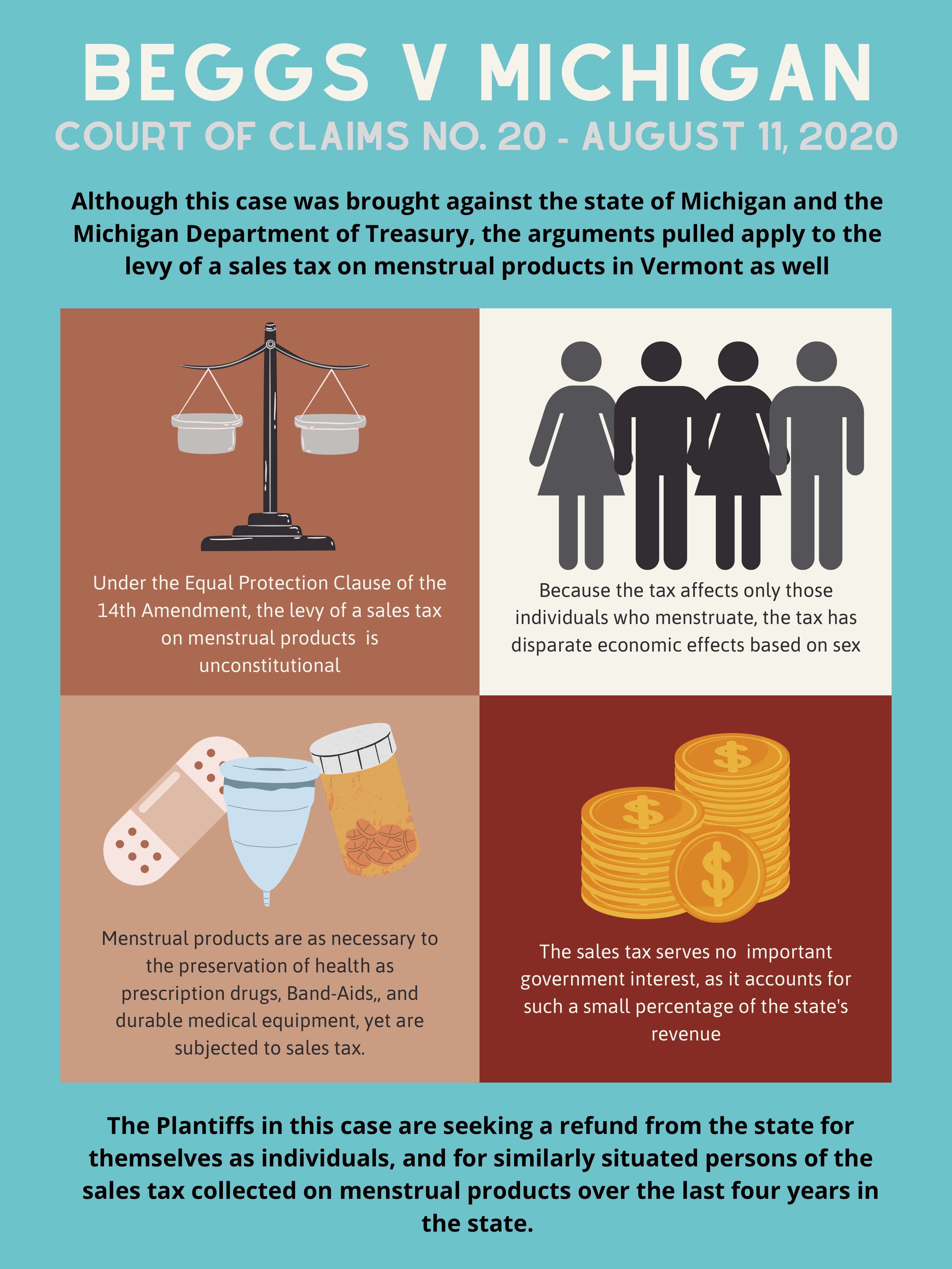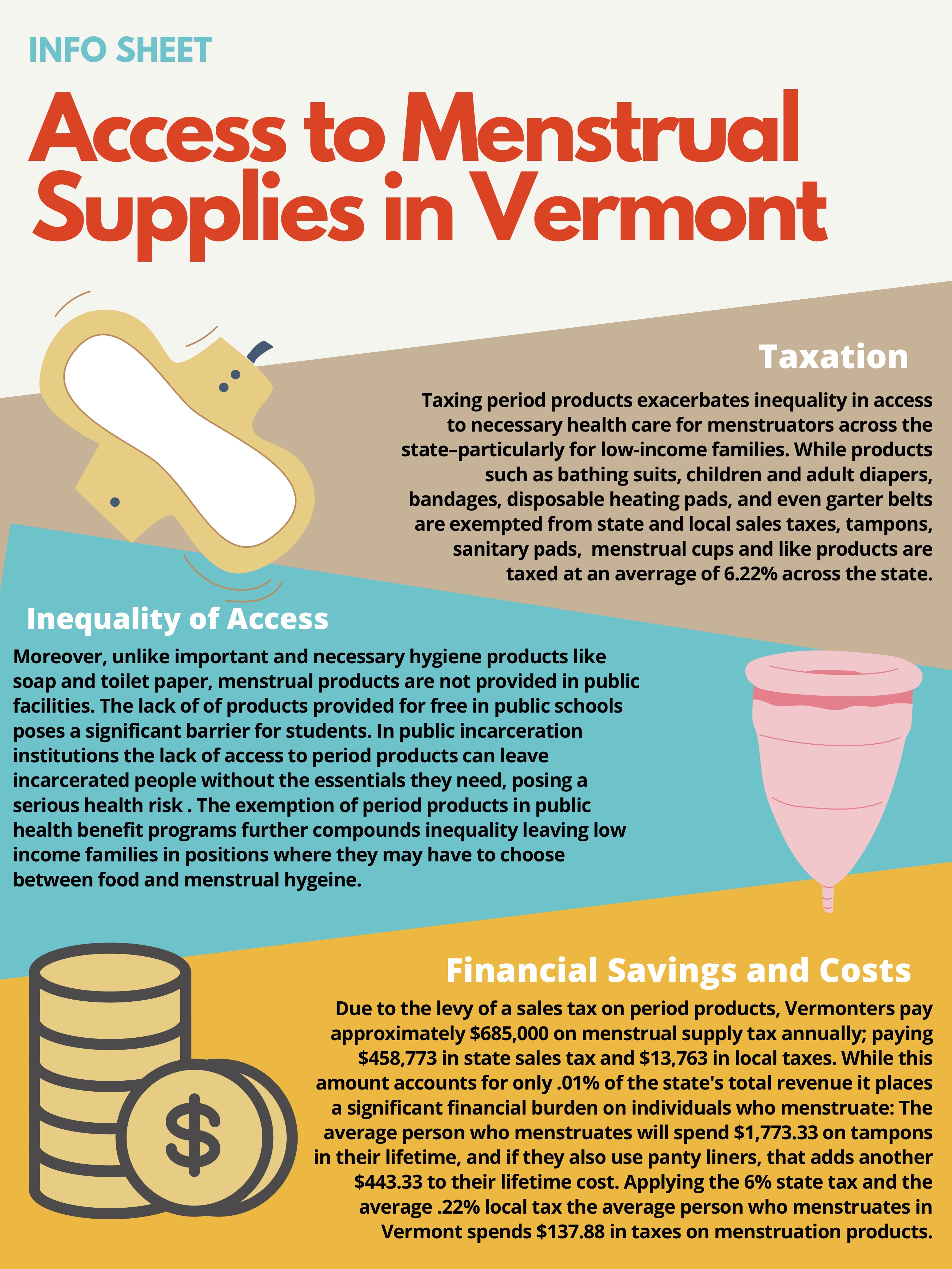 [2] Vermont Commission on Women. Taxation of Menstrual Supplies in Vermont Info Sheet, 2019. https://women.vermont.gov/sites/women/files/Info_Sheet_Taxation_of_Mentrual_Supplies_2019_FINAL.pdf